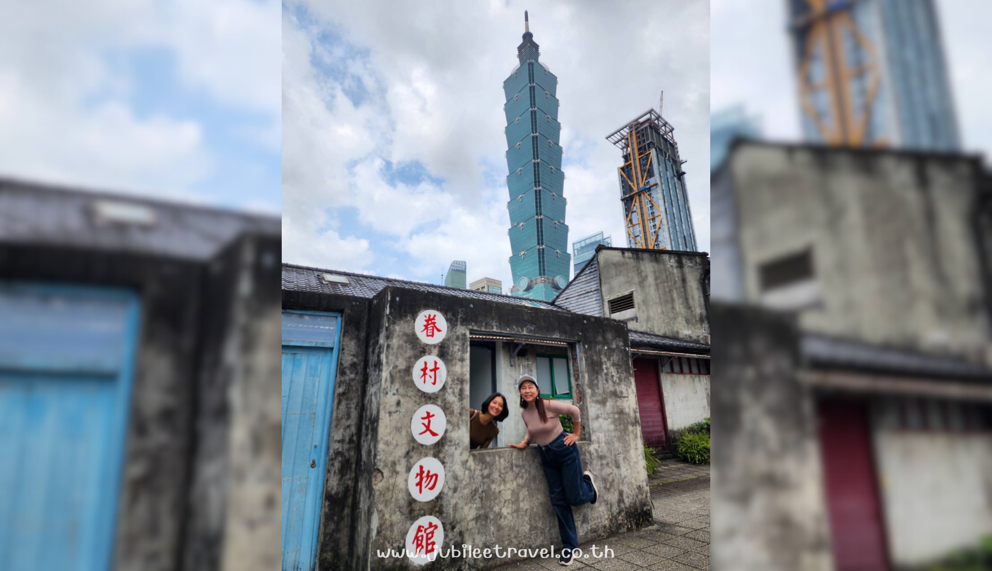 ถ่ายรูปเช็คอินกับตึก Taipei 101 ตรง Four Four South Village ได้บรรยายวินเทจตัดกับตึกที่ดูทันสมัย