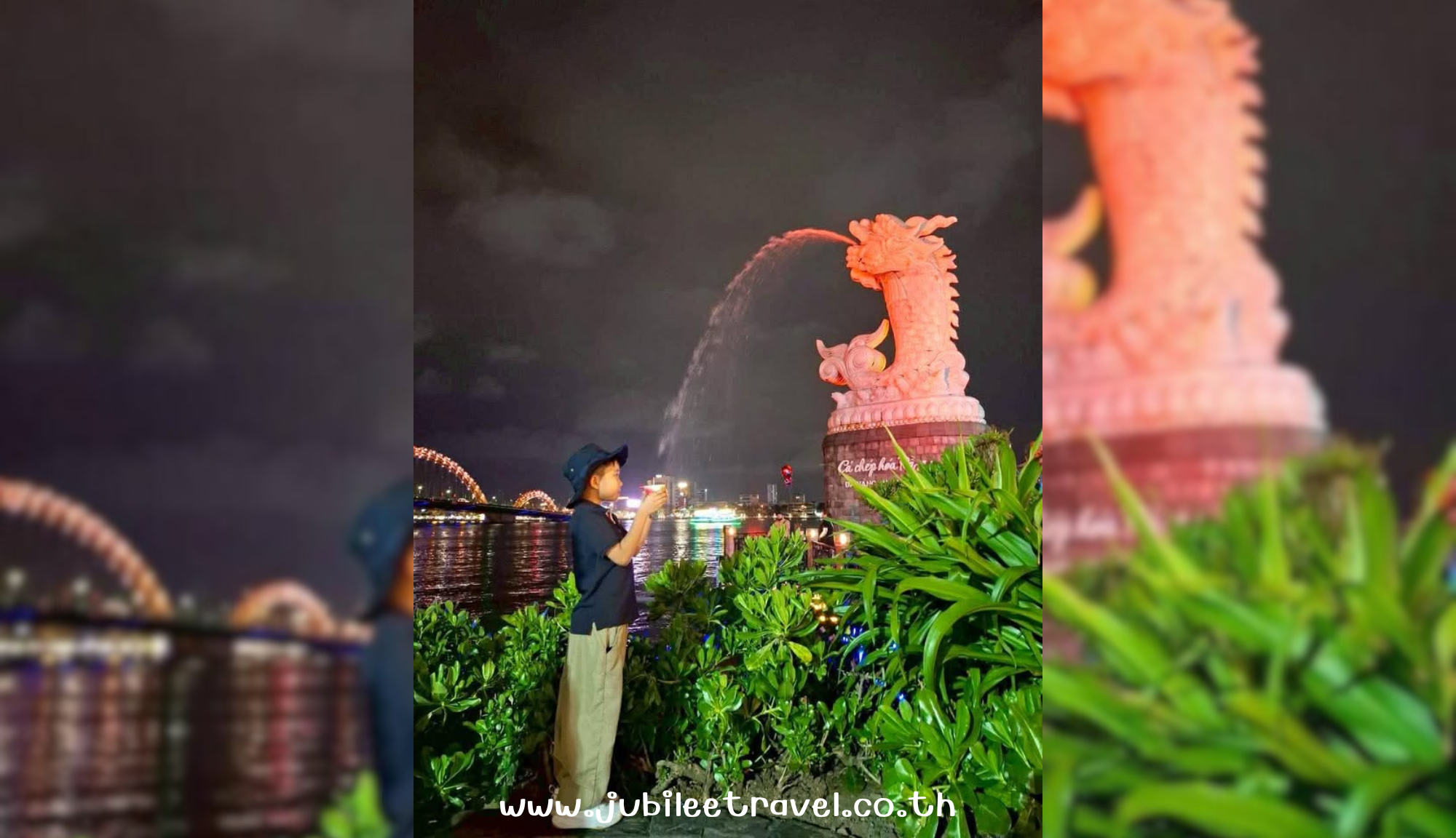 ถ่ายรูปคู่กับ รูปปั้นปลามังกร ที่ริมแม่น้ำฮัน เมืองดานัง