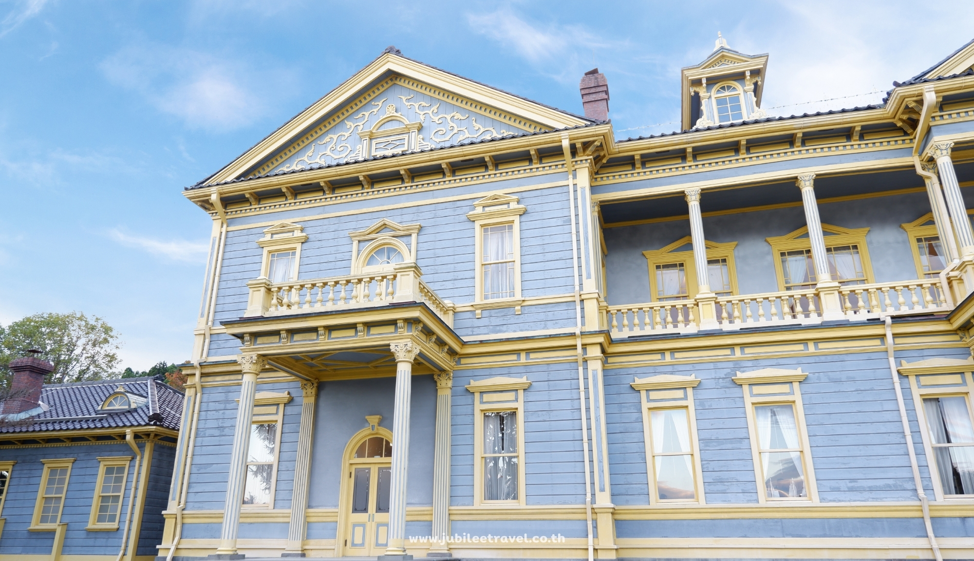 ตัวอาคารทาด้วยโทนสีเหลืองมัสตาร์ดตัดกับสีฟ้า บอกเลยว่าสะดุดตามาก เป็นสไตล์ Western Classic ผสมความญี่ปุ่นแบบละมุนๆ