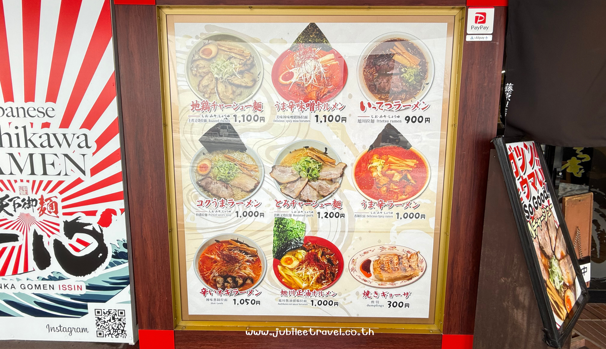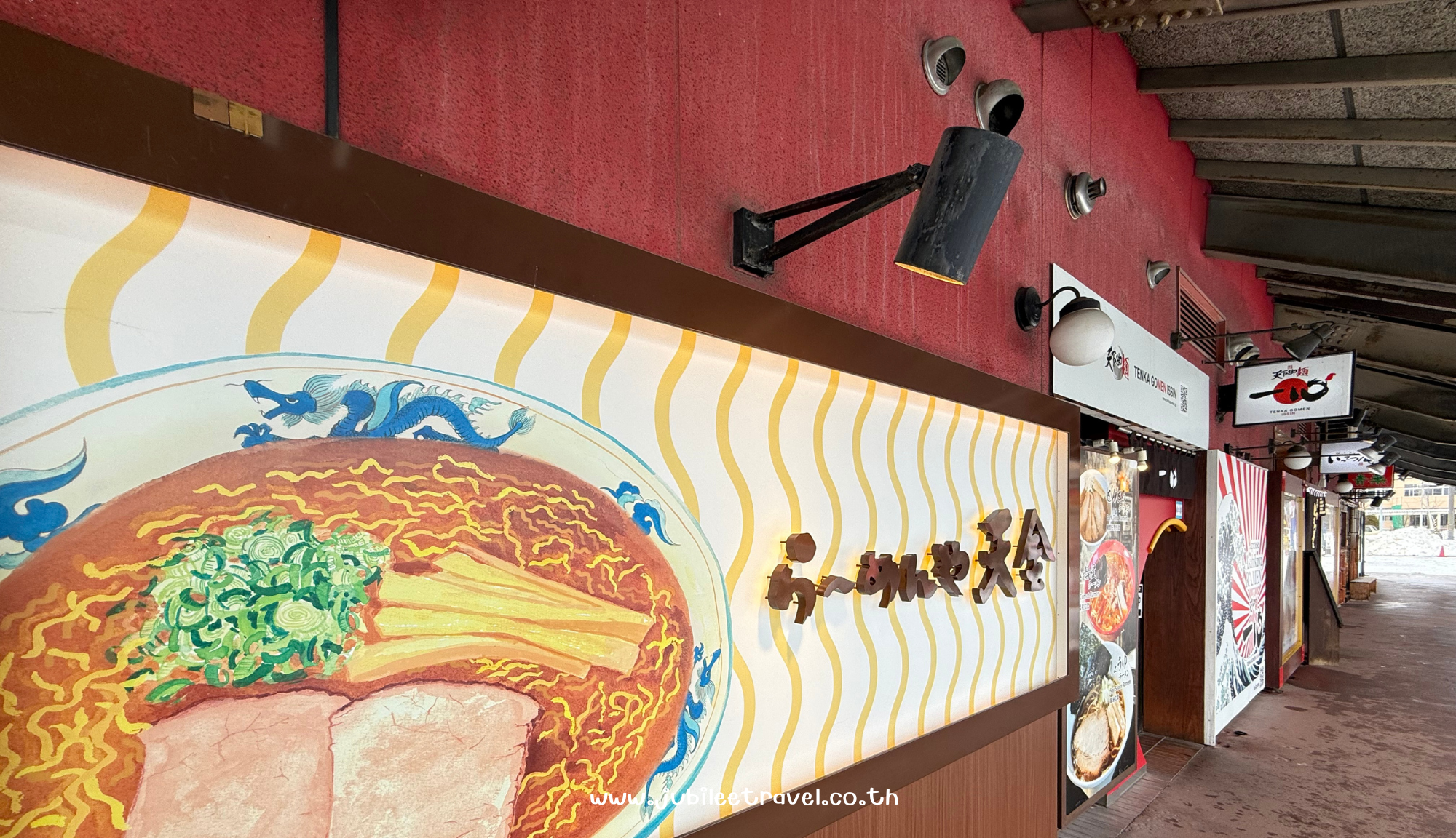 หน้าร้าน Asahikawa Ramen Village เป็นอาคารสีแดงเด่น มีป้ายใหญ่ หน้าร้านแต่ละร้านจะมี ธงและป้ายเมนูญี่ปุ่นเด่นๆ เห็นชัดเมื่อยืนอยู่ด้านหน้าทางเข้าได้ชัด จำง่าย