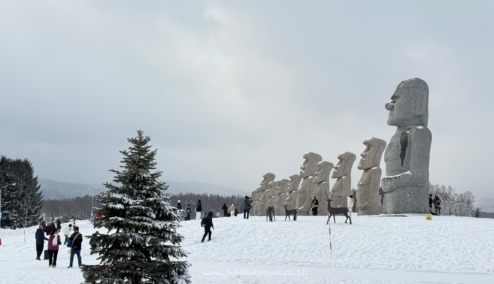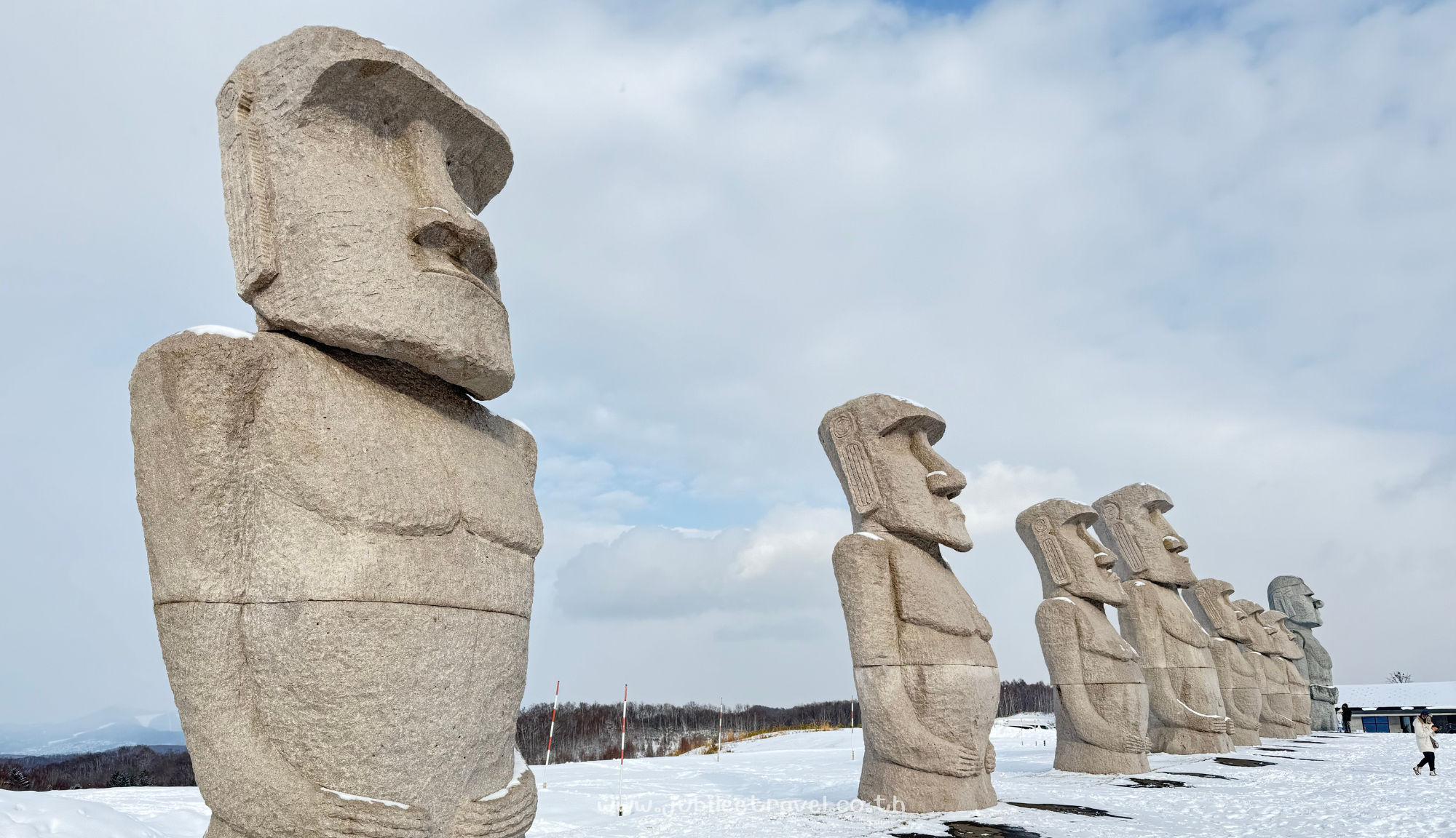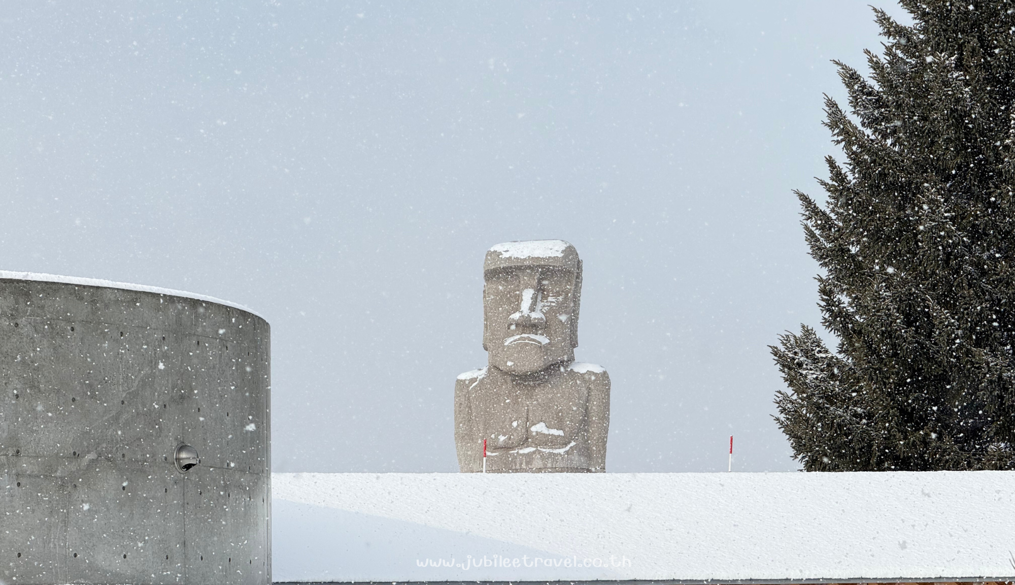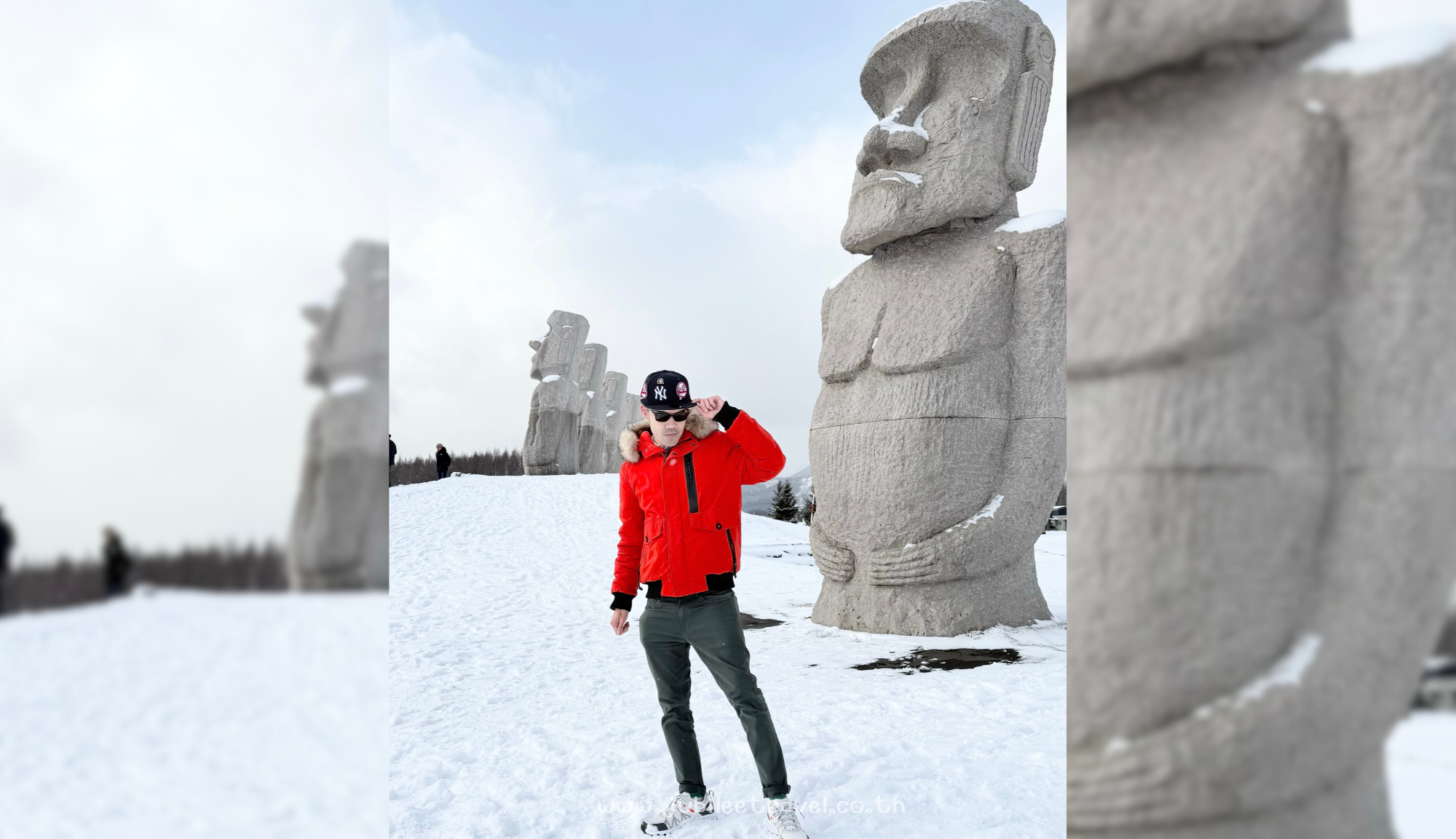 ใครมาเนินพระพุทธเจ้าแล้วแนะนำต้องแวะมาถ่ายรูปกับรูปปั้นโมอาย มุมถ่ายรูปเท่มาก ฟีลลึกลับนิดๆ ตัดกับหิมะสีขาวโพลนได้รูปออกมาสวยแน่นอนค่ะ