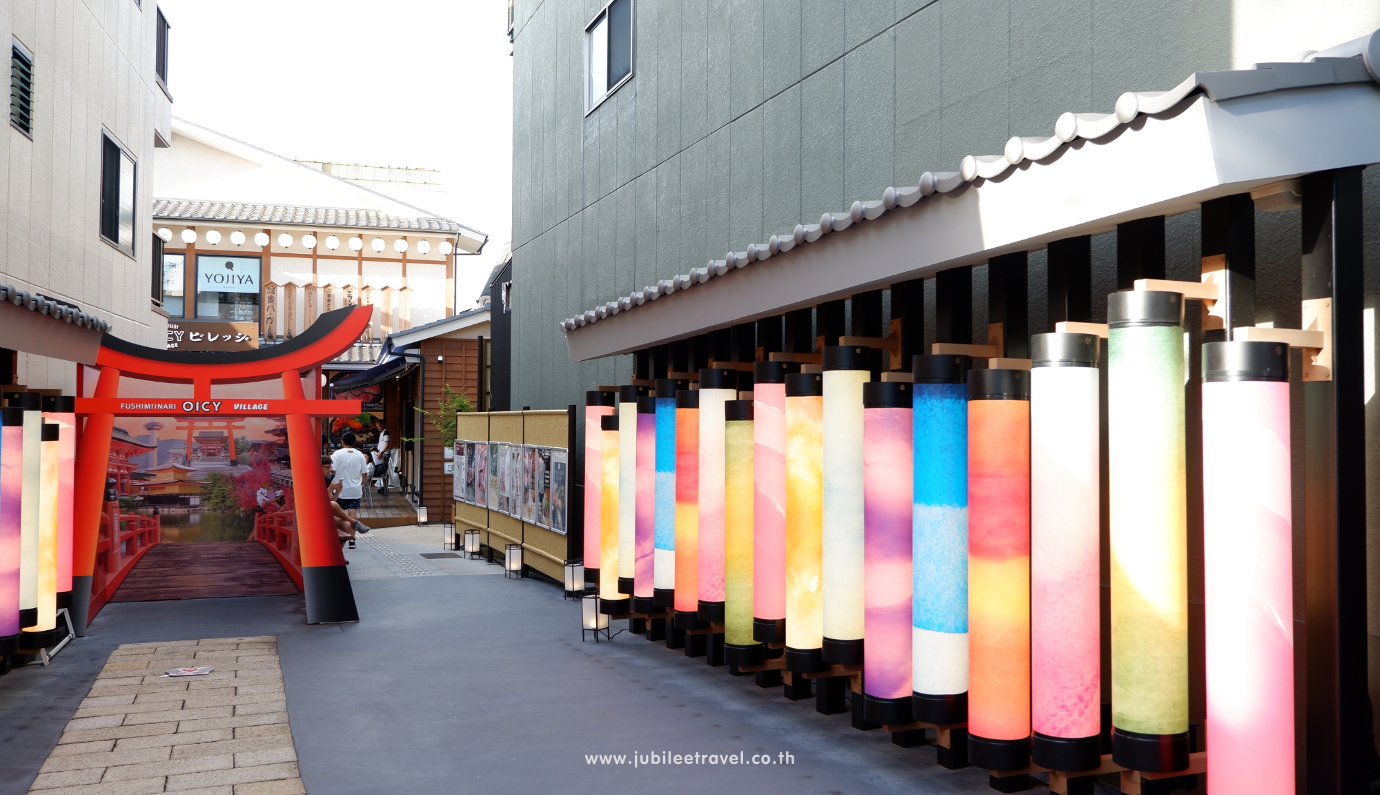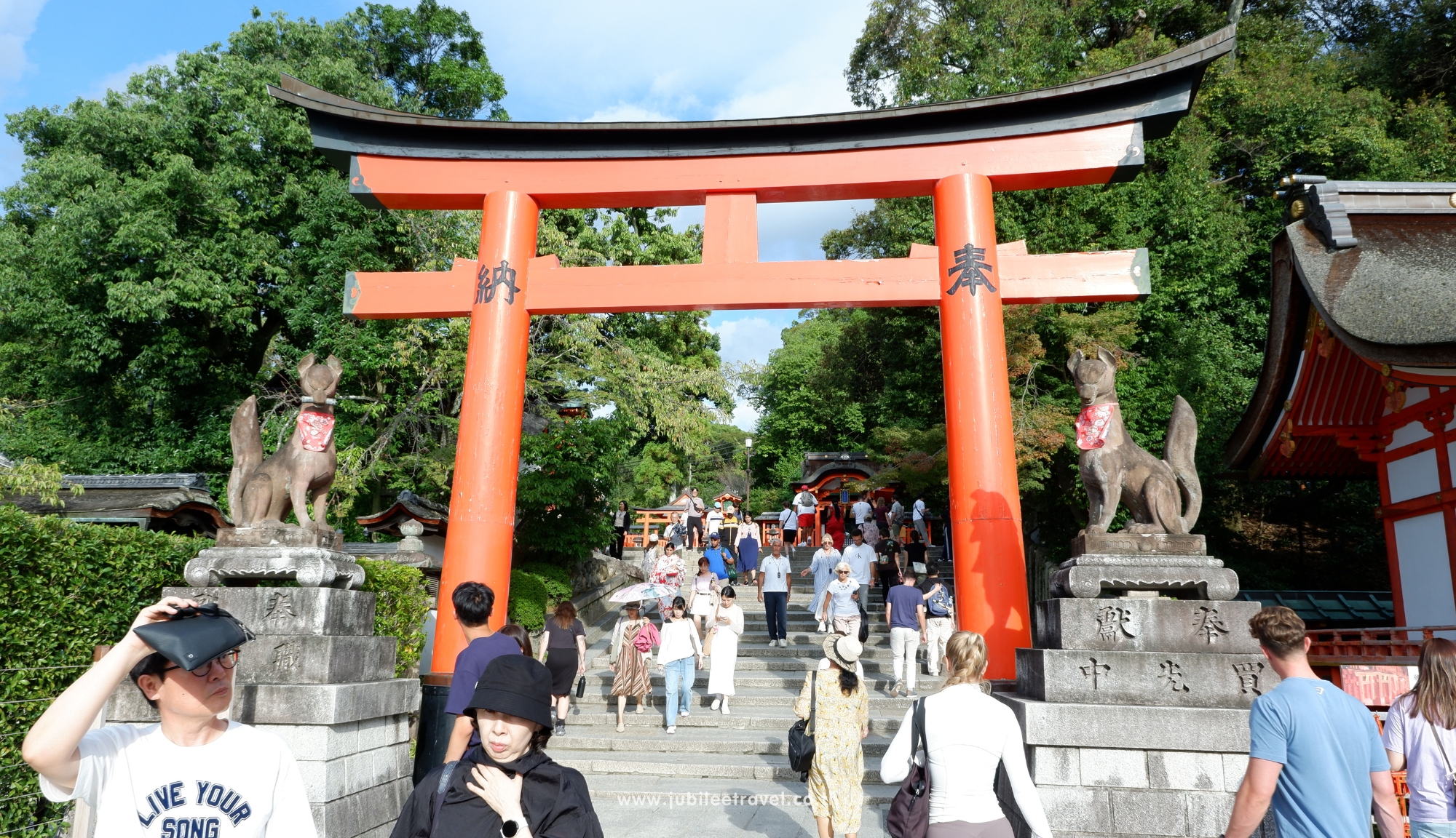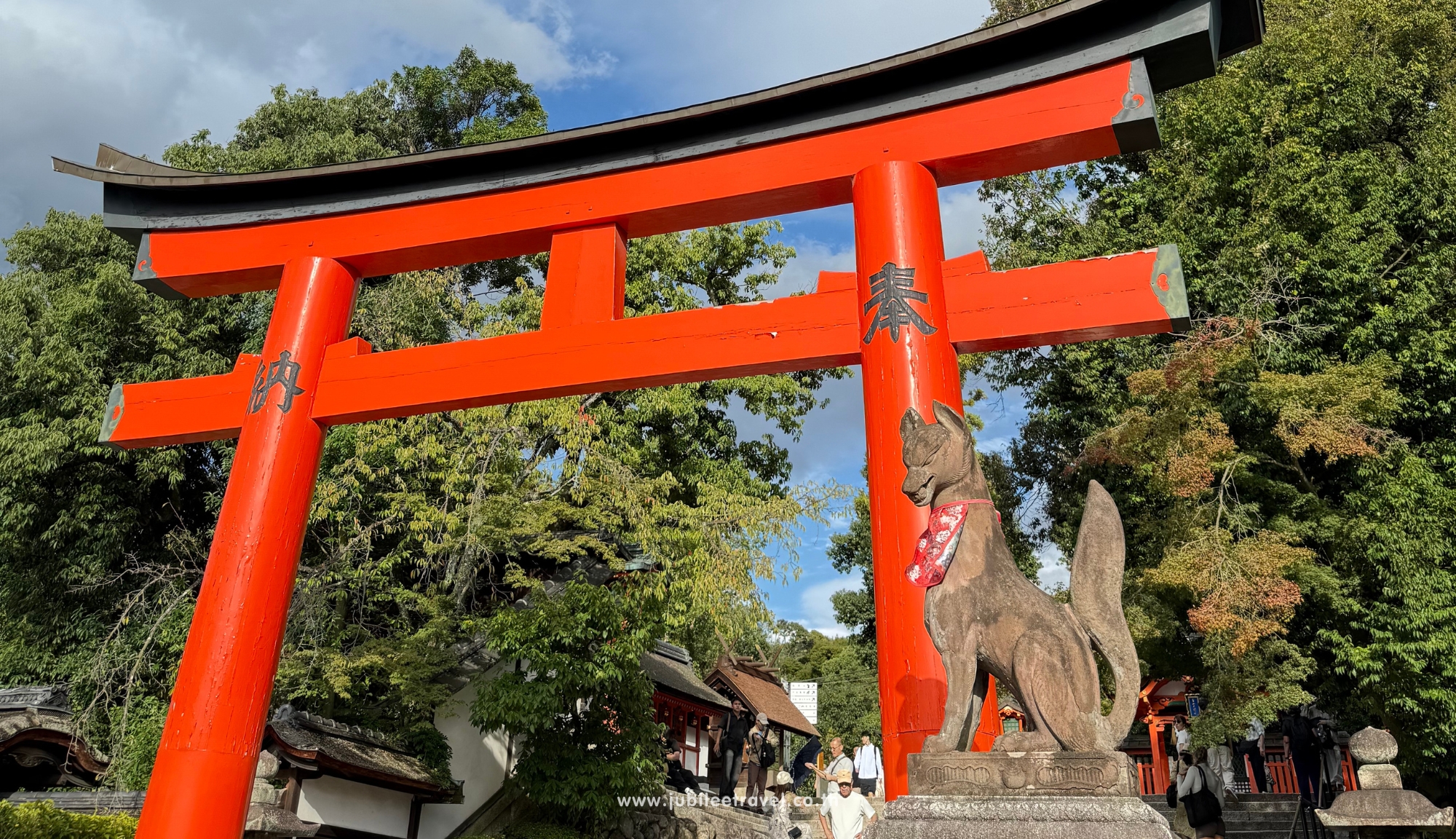 นู๋JUB เริ่มเดินจากด้านหน้าศาลเจ้า ผ่าน รูปปั้นสุนัขจิ้งจอก (Kitsune) ที่เชื่อกันว่าเป็นผู้ส่งสารของเทพอินาริ แต่ละตัวจะคาบของต่างๆ เช่น กุญแจ ข้าว หรือจรวด
