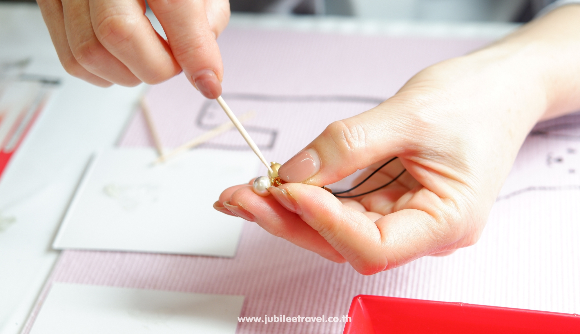 พนักงานเล่าว่าไข่มุกต้องใช้เวลาหลายปีในการเจริญเติบโต และแต่ละเม็ดมีคุณค่าเฉพาะตัว การได้เห็นกระบวนการทั้งหมดทำให้ นู๋JUB เข้าใจเลยว่า ทำไมไข่มุกถึงราคาแพงและมีคุณค่าทางวัฒนธรรม